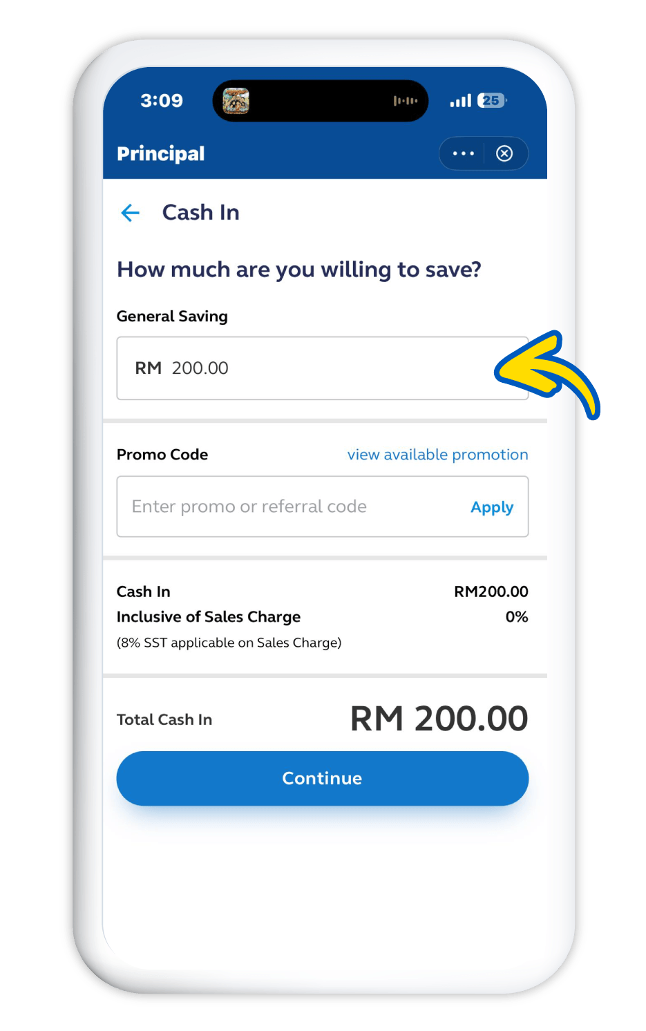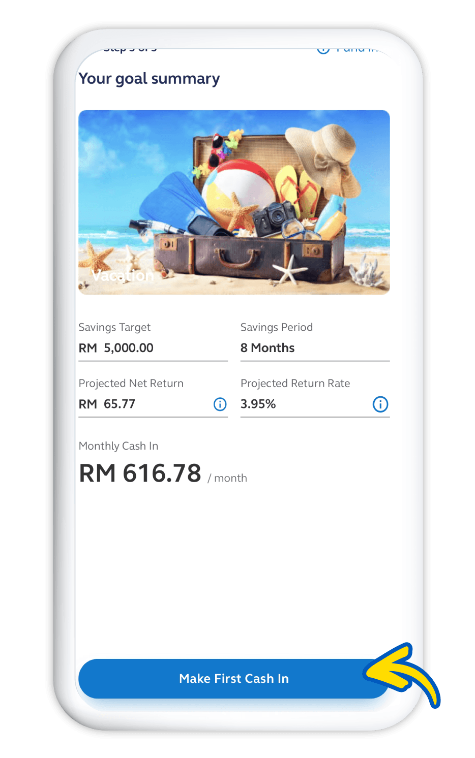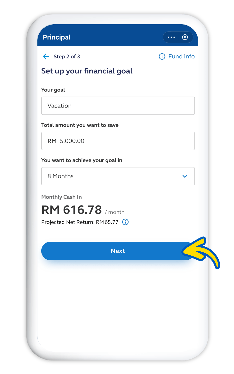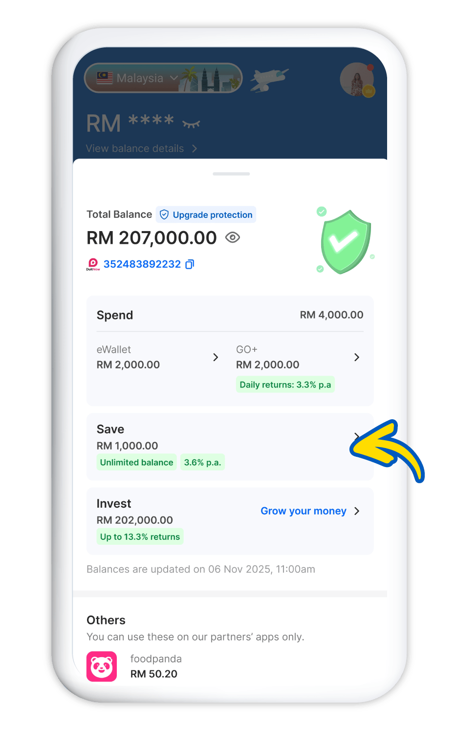 The money you set aside is kept separate from your wallet balance, helping reduce the chance of accidental spending. Your money is invested in the Principal Islamic Money Market Fund, managed by Principal Asset Management, with projected returns of up to 3.49% p.a.*